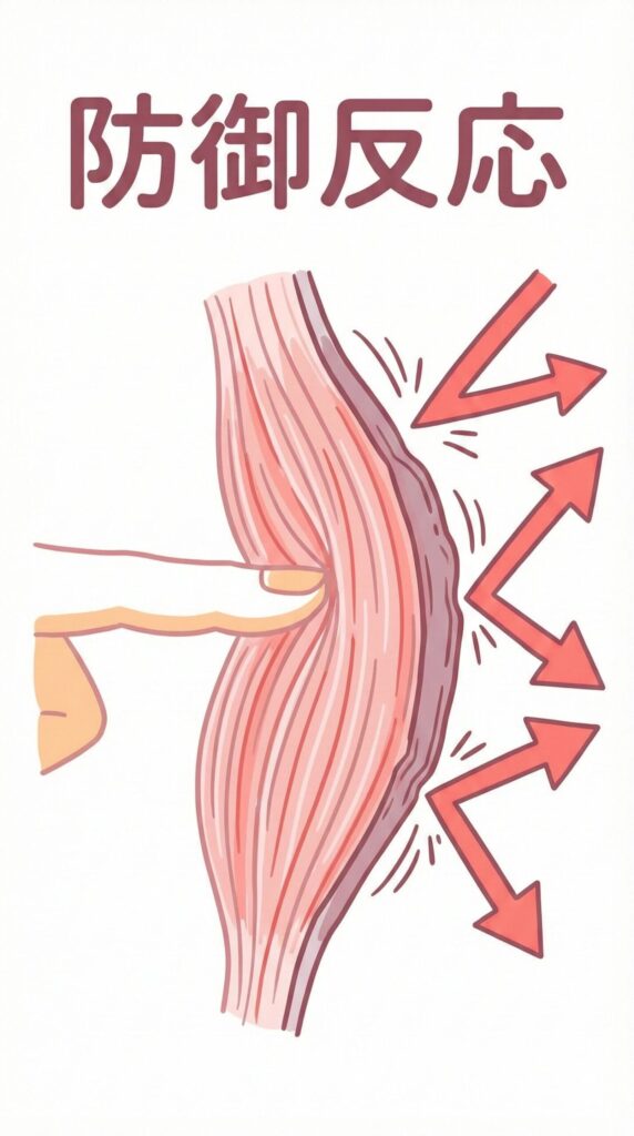 (プロンプト内容:強い刺激に対して、筋肉がギュッと縮こまって指を弾き返している様子。「防御性収縮」の文字入り)