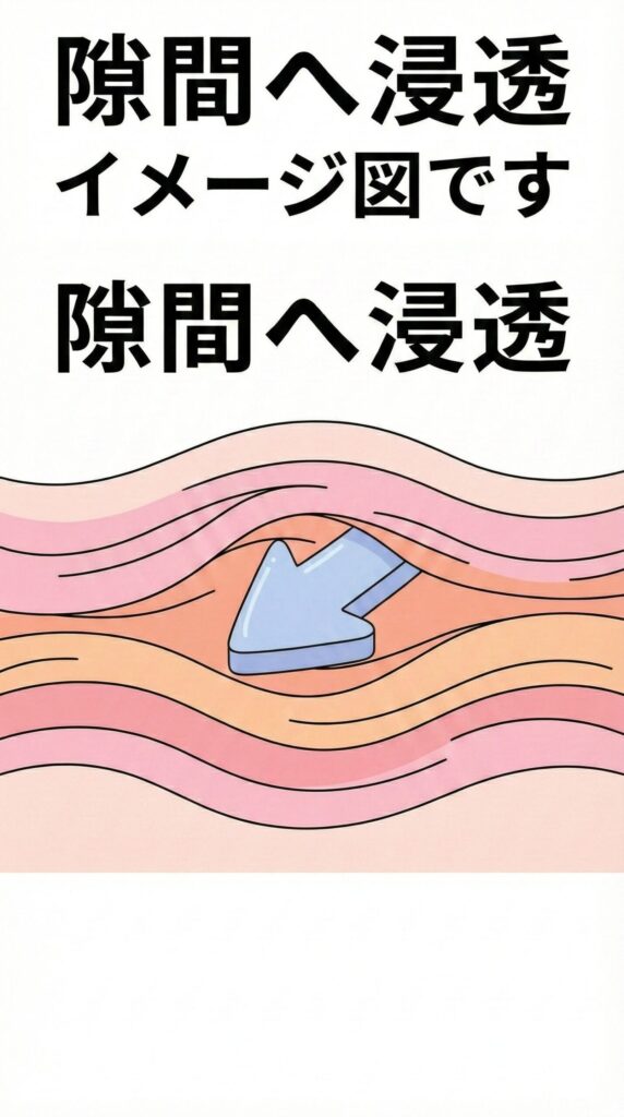(プロンプト内容:指が筋繊維を傷つけず、繊維と繊維の「隙間」にするりと入っていく断面図。「組織間隙を狙う」の文字入り)